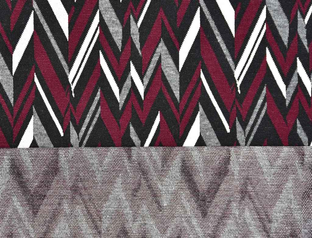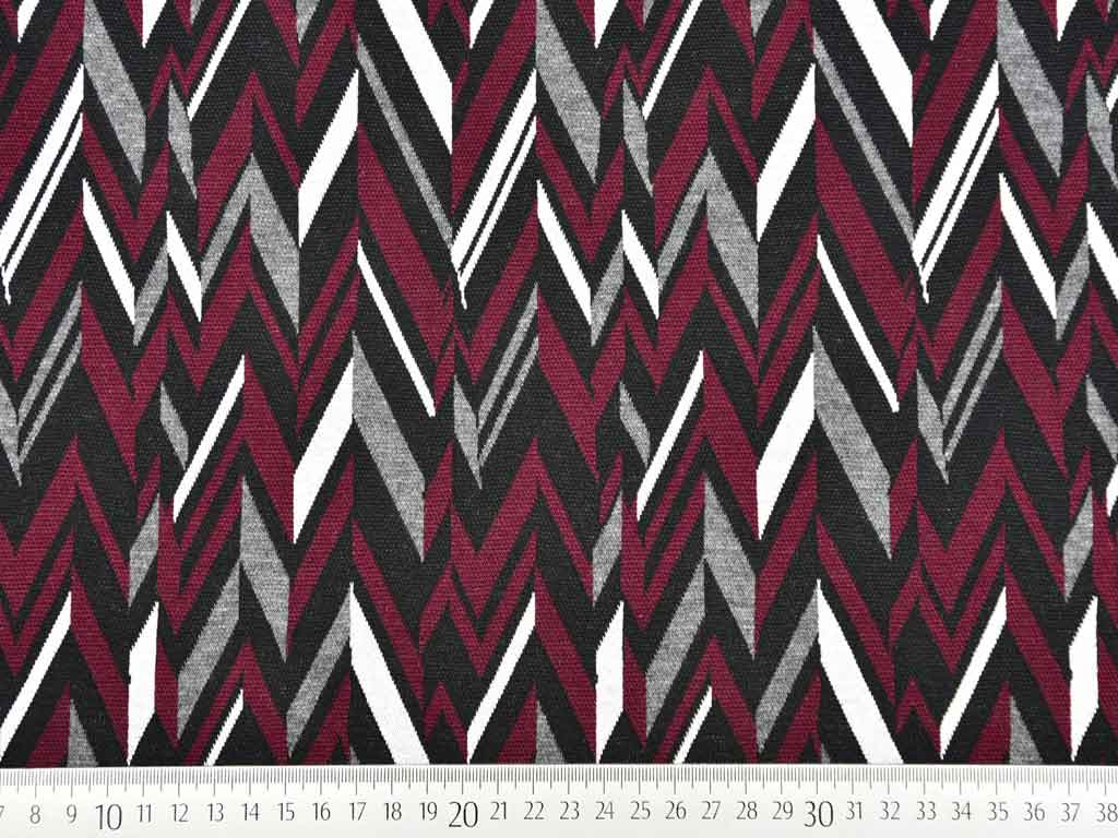 Ein weicher elastischer Jacquard Jersey (Strick) mit Zick Zack Muster in dunklem Bordeaux, grau, schwarz und weiß.