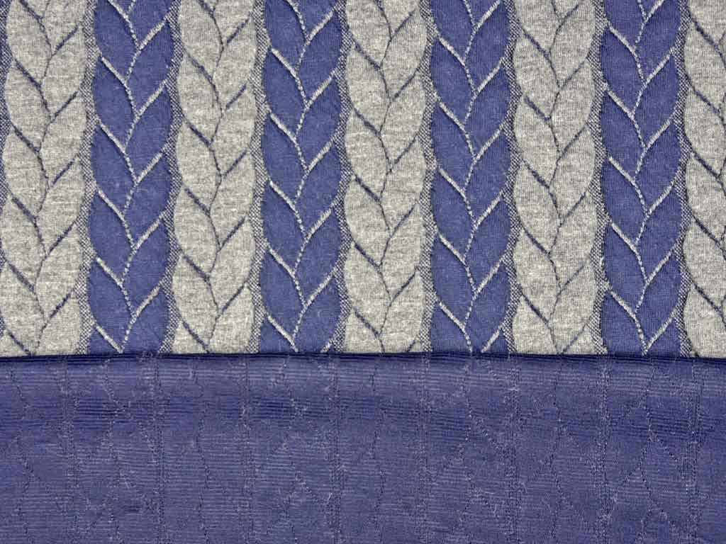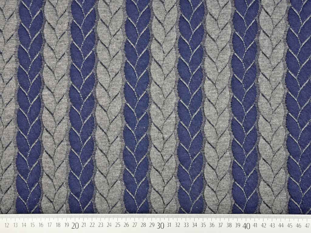 Ein weicher Jacquard Jersey mit Zopfmuster in grau melange und dunkelblau, abgesteppt zu einem Zopfmuster. Die Rückseite ist dunkelblau. Durch den Stepp erhält der Stoff eine schöne 3D-Struktur und fühlt sich weich an.