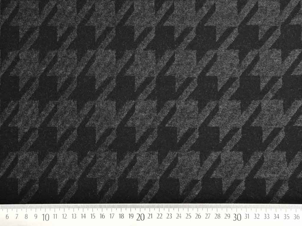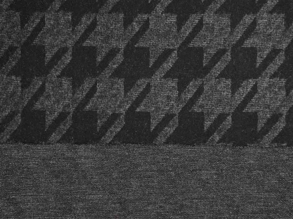 Ein elastischer Jacquard Jersey in anthrazit mit schwarzem Hahnentrittmuster. Die Oberseite ist angeraut und hat somit einen wunderbar weichen, wolligen Griff.