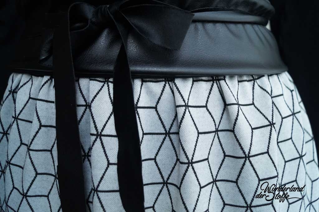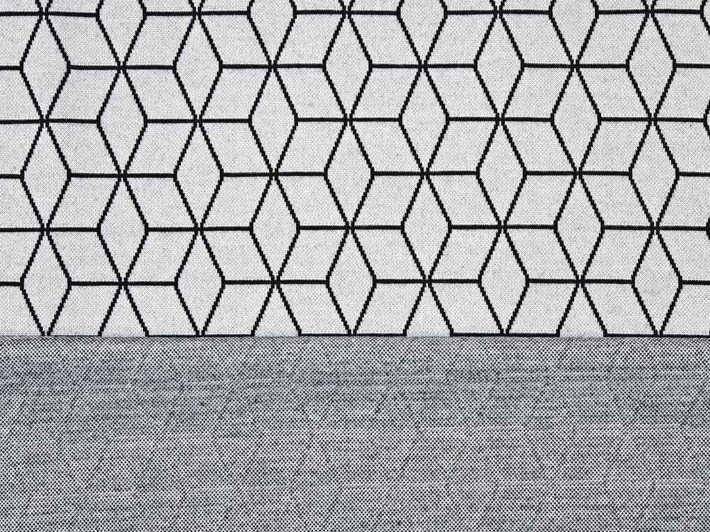 Ein hellgrauer Jacquard in feinem Strick mit schwarzen grafischen Linien/ Würfelmuster.