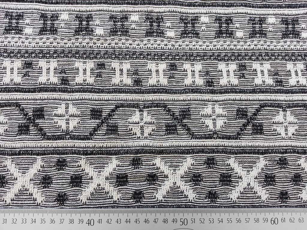 Ein weicher Jacquard Strick mit mexikanischem Muster in schwarz und ecrue (cremeweiss). Der Stoff ist mit goldenen Glitzerfäden durchzoge und verleiht dem Stoff einen Hauch von Glitzer und Glamour! Einfach super trendy!