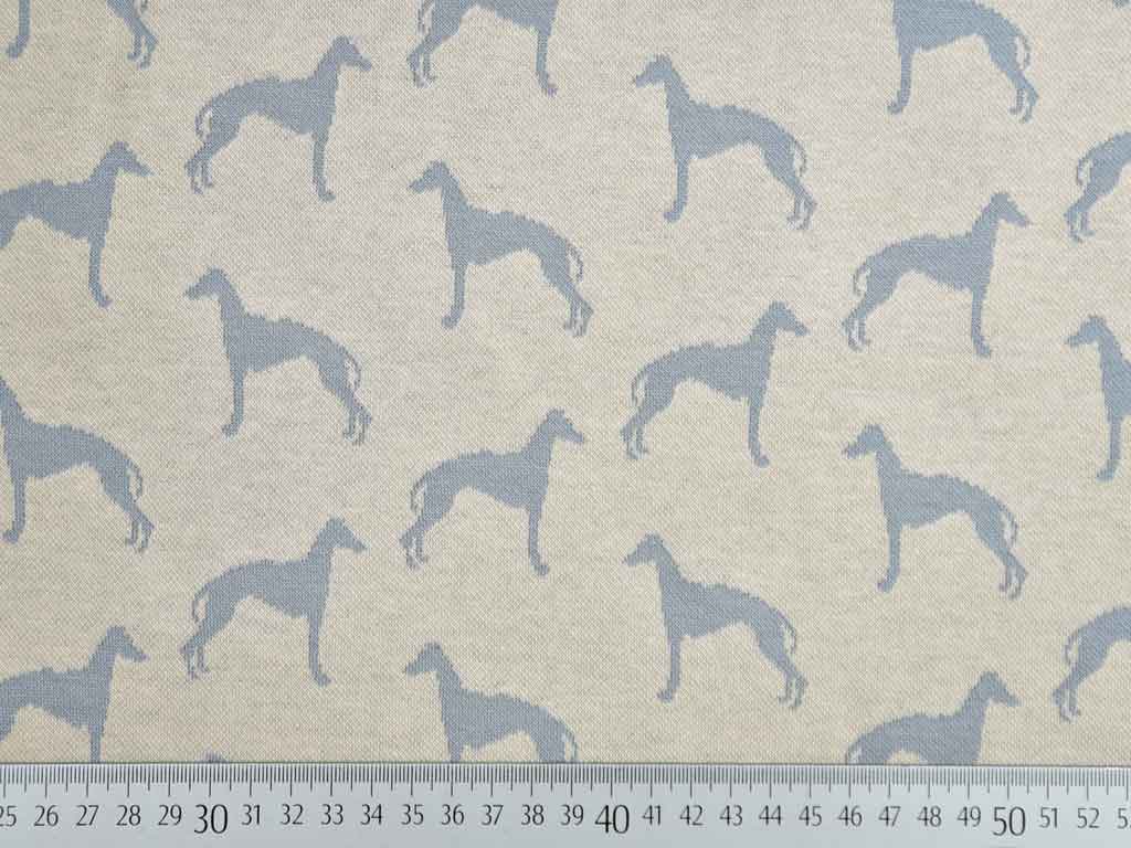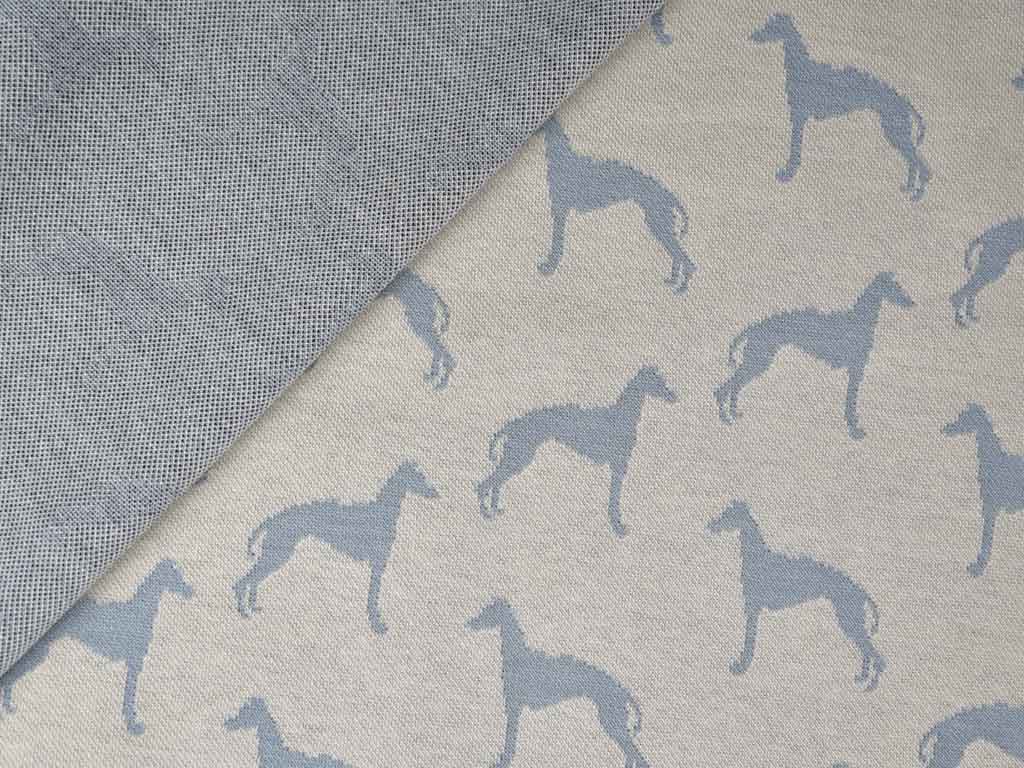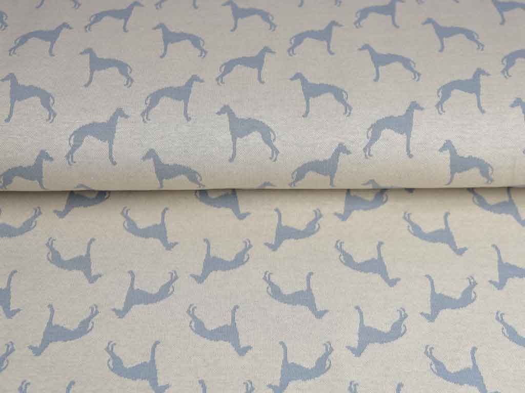 Ein hochwertiger, hellbeiger Jacquard Strickjersey mit grauen Windhunden. Der Stoff ist weich im Griff und liegt angenehm auf der Haut.