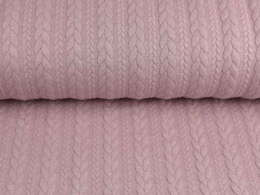 Ein weicher Jacquardstoff in Altrosa mit klassischem Zopfmuster. Der Stoff ist elastisch und dehnt sich leicht.