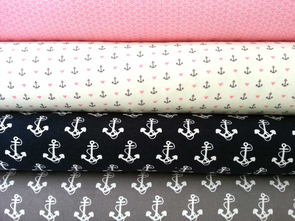 Ein weicher Interlock aus 100% Baumwolle in grau mit weißen Ankern und kleinen grauen Sternchen.