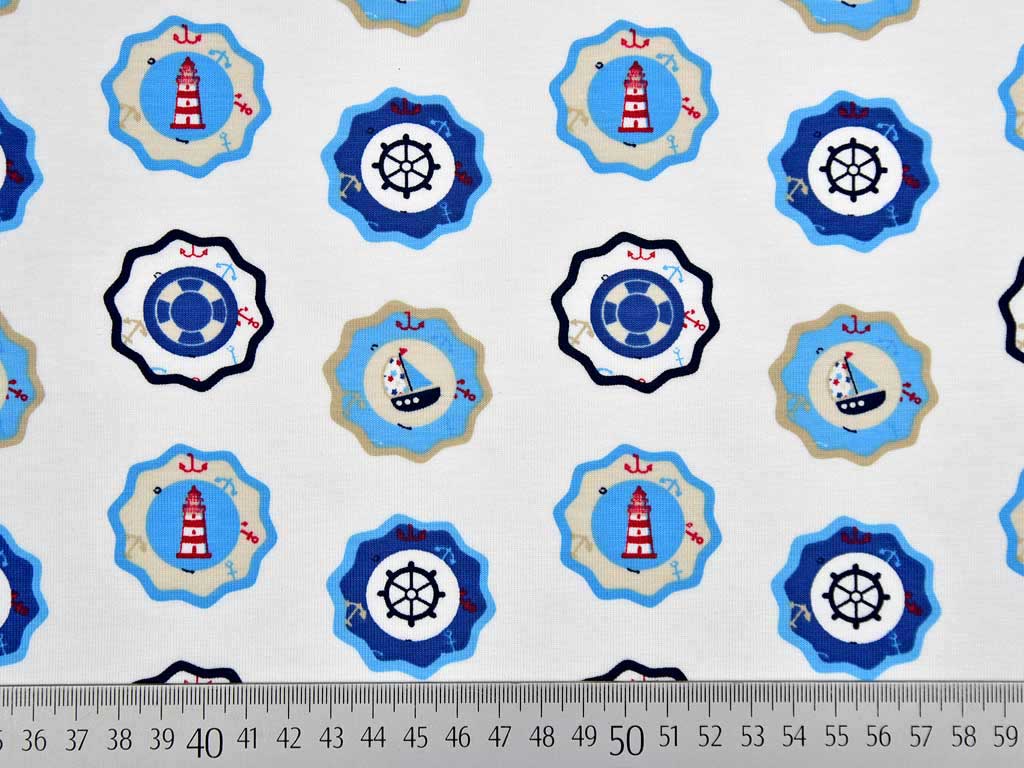 Ein weicher Baumwolljersey in cremeweiß mit maritimen Buttons mit Leuchttürmen, Steuerrädern, Segelbooten und Ankern in dunkelblau, jeansblau, weiß, beige und kirschrot.
