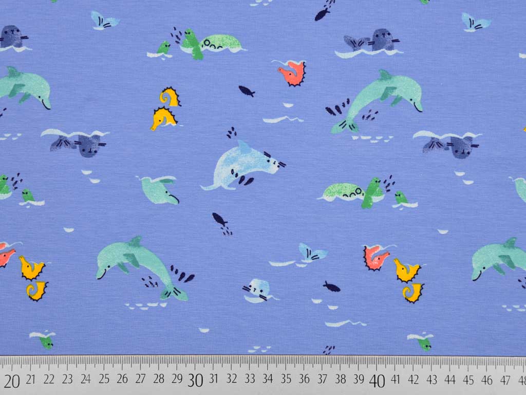 Ein weicher Baumwolljesey in hellblau mit süßen Delfinen, Seepferdchen und Seelöwen.