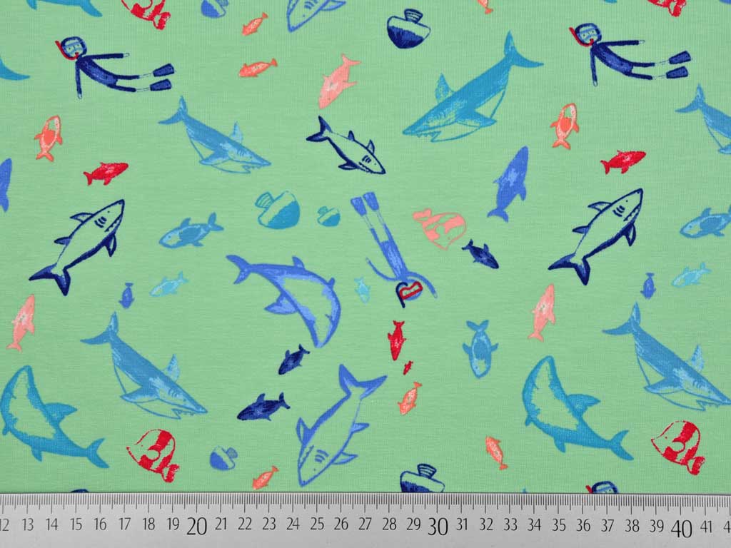 Ein weicher Baumwolljesey in hellgrün mit verschiedenen Fischen und Tauchern.