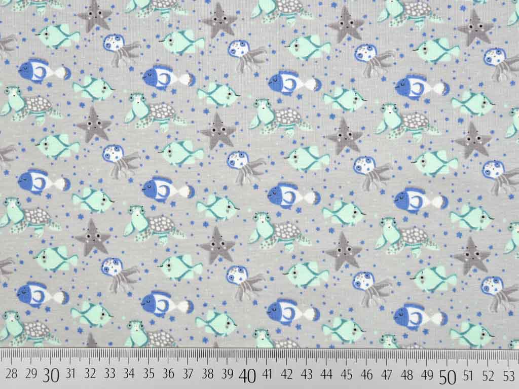 Ein sehr süßer hellgrauer Jersey mit blauen und dunkelblauen Fischen, Seesternen und Kraken.