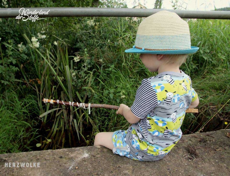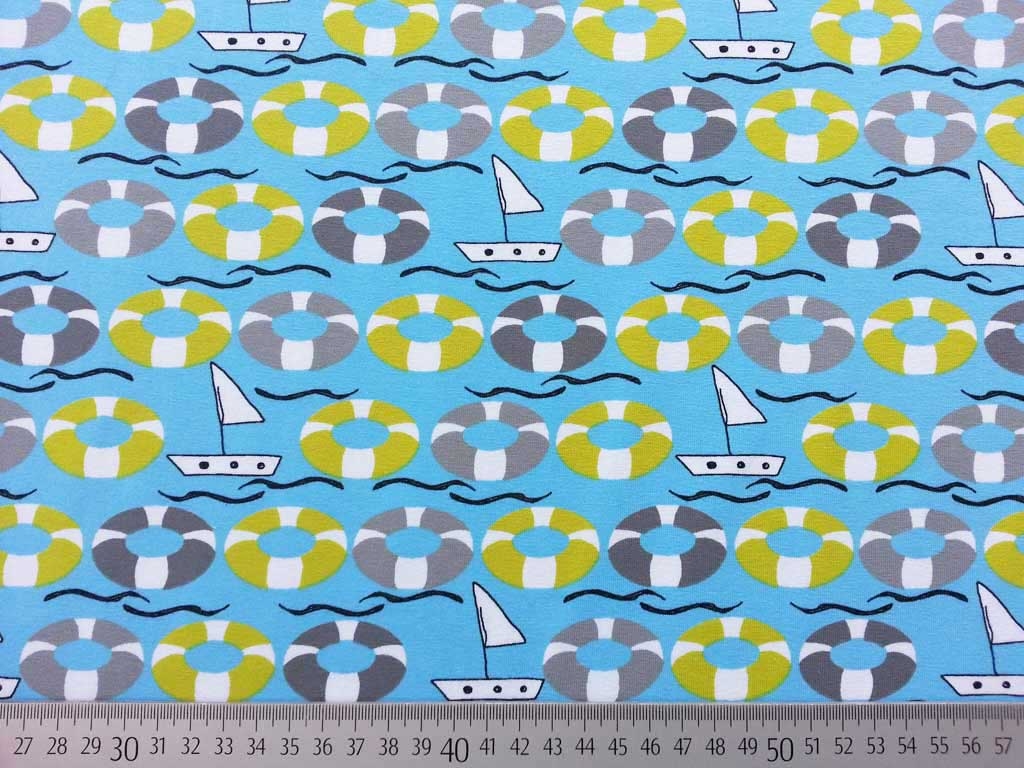 Ein wunderschöner Baumwolljersey in blau mit grüngelb-weiss und grau-weiss gestreiften Rettungsringen und kleinen Segelbooten.