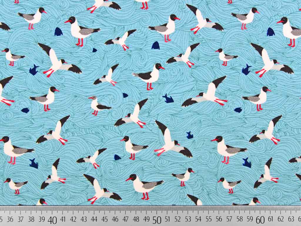 Ein weicher Baumwolljersey von der Designerin Lila-Lotta mit Möwen und kleinen Fischen auf helltürkisemWellenmuster.