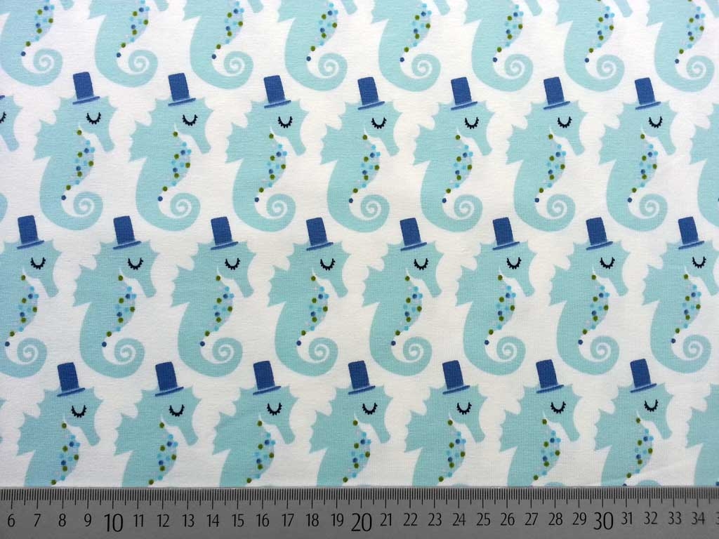 Ein weicher Jersey in weiß mit Seepferdchen in eisblau und mittelblau.