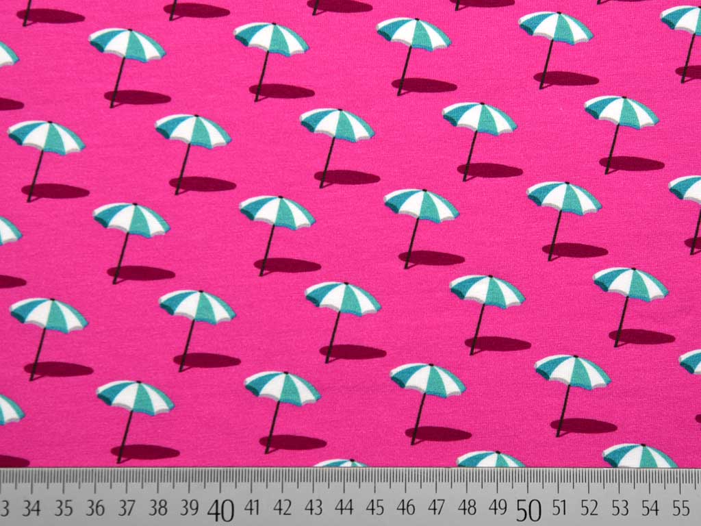 Ein dunkelpinker Baumwolljersey (mit dem Namen Alla Spiaggia) von Hamburger Liebe aus der Kollektion Amore mit mint-weiß gestreiften Sonnenschirmen. Produziert von Hilco in bekannt hochwertiger Qualität.