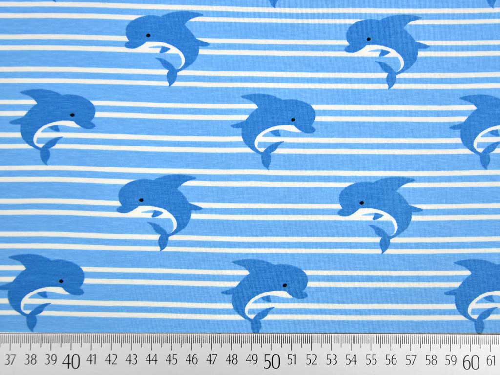 Ein weicher gestreifter Baumwolljersey in hellblau-weiß mit blauen Delfinen.