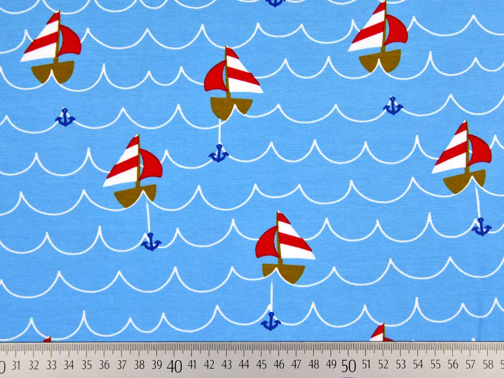 Ein weicher Baumwolljersey in hellblau mit Segelbooten und Wellen.