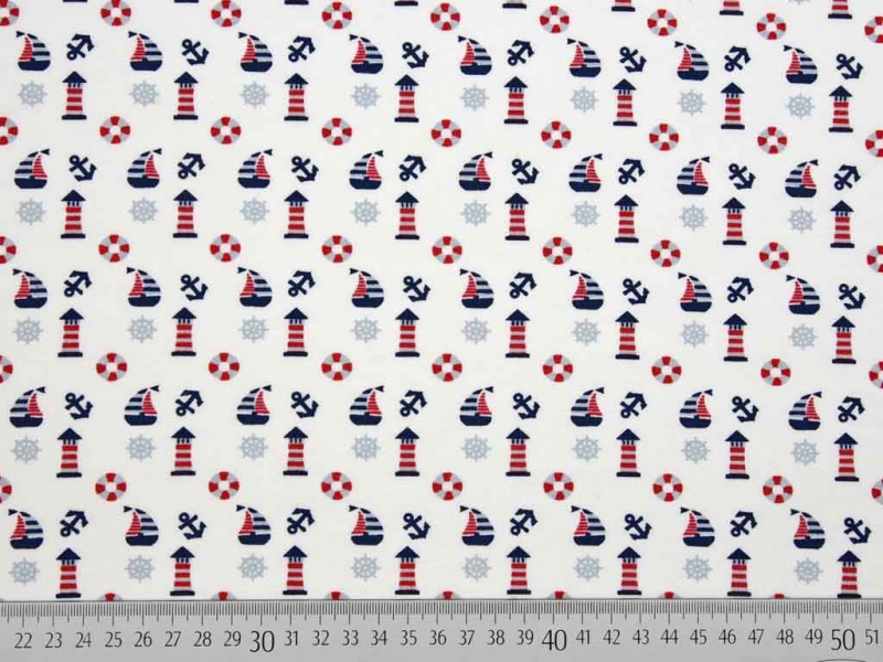 Ein super süßer Jersey in weiß mit kleinen maritimen Motiven wie Ankern, Segelbooten, Leuchttürmen und Steuerrädern.