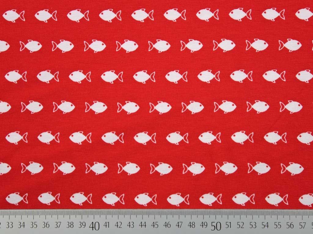 Ein weicher Baumwolljersey in rot mit kleinen weißen Fischen.