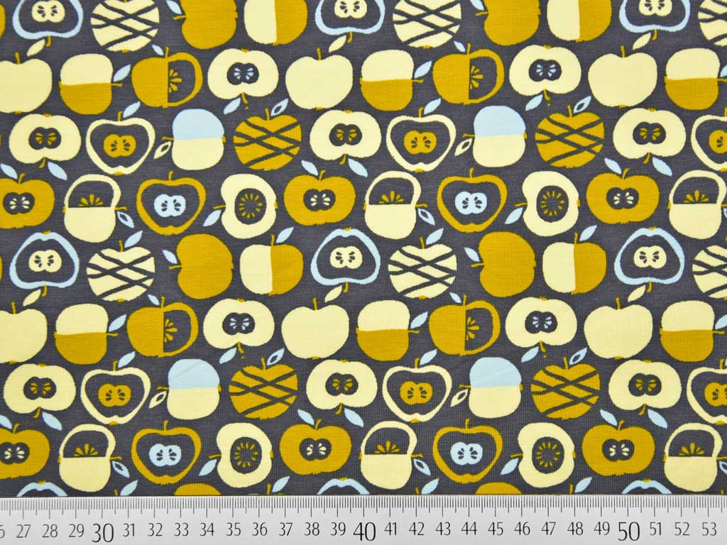 Ein wunderschöner Jersey aus Baumwolle (Bio) in dunkelgrau mit gemusterten Äpfeln in ockergelb, vanille und rauchblau.