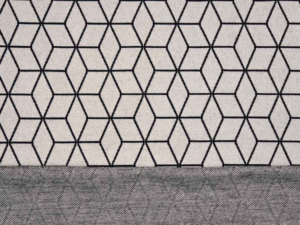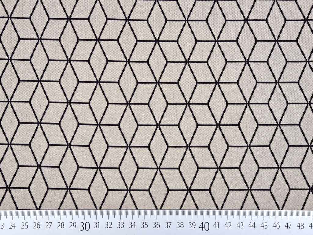Ein beiger Jacquard in feinem Strick mit schwarzen grafischen Linien/ Würfelmuster.
