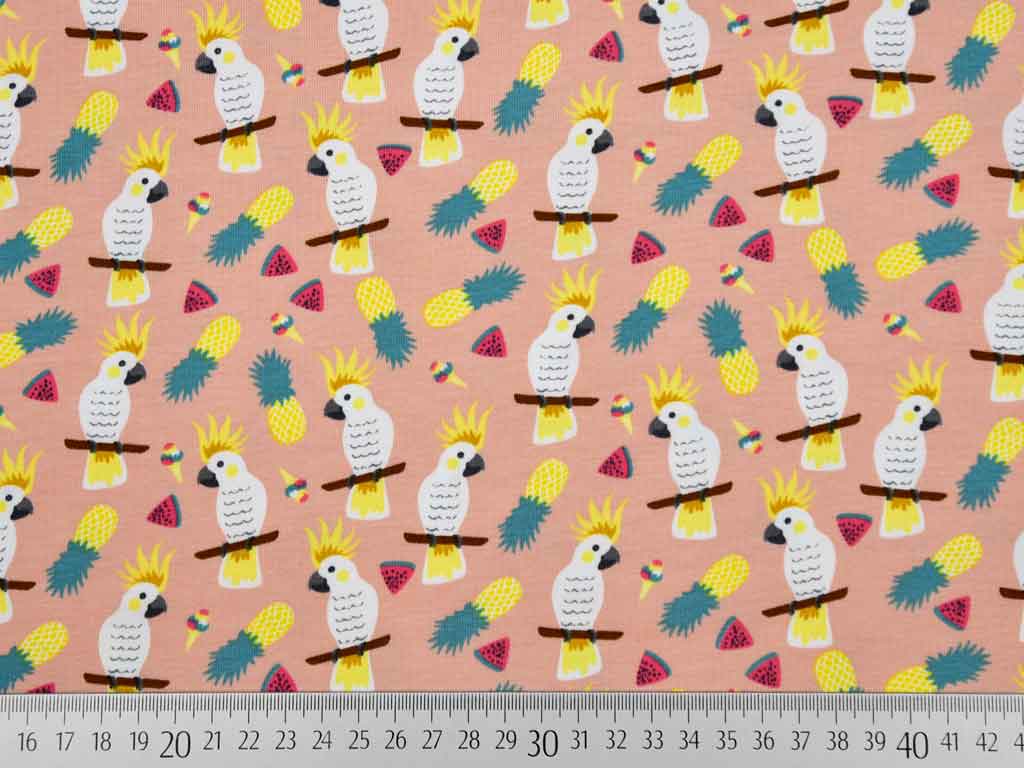 Ein toller apricotfarbener Jersey mit weißen Kakadus, Melonen und Ananas.