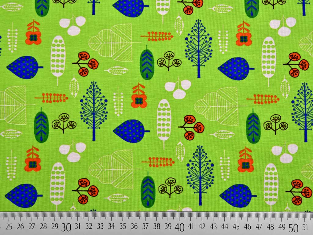 Ein super süßer Kinderjersey von Little Darling in hellgrün mit Blättern, Bäumen und Blumen in königsblau, orange und ecrue.