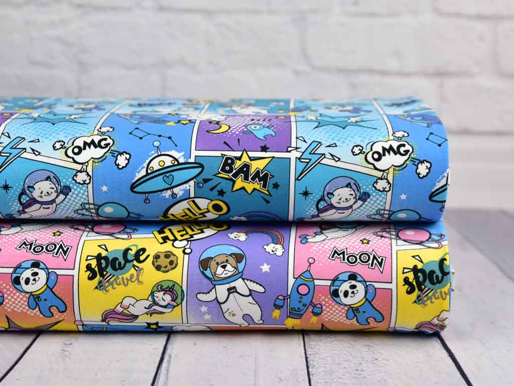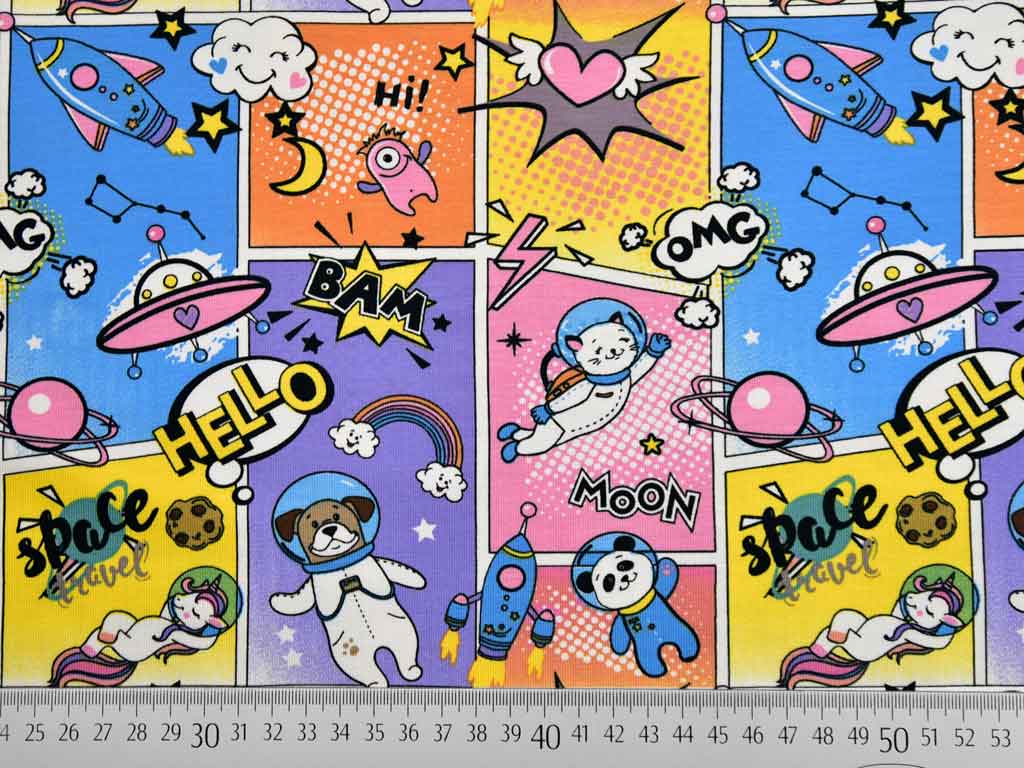 Ein cooler bunter Baumwolljersey im Comicstil mit lustigen gelben, pinken und lilafarbenen Hunden, Einhörnern und Raketen.