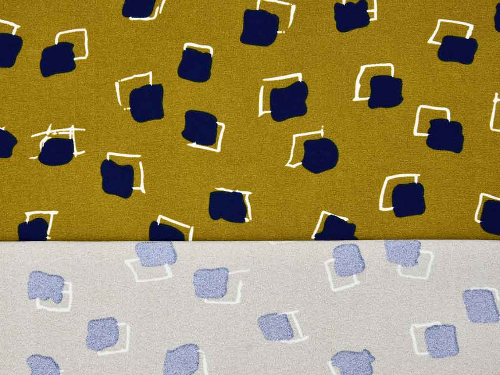 Ein weicher Crepe Jersey in dunkelblau mit ocker Quadraten.