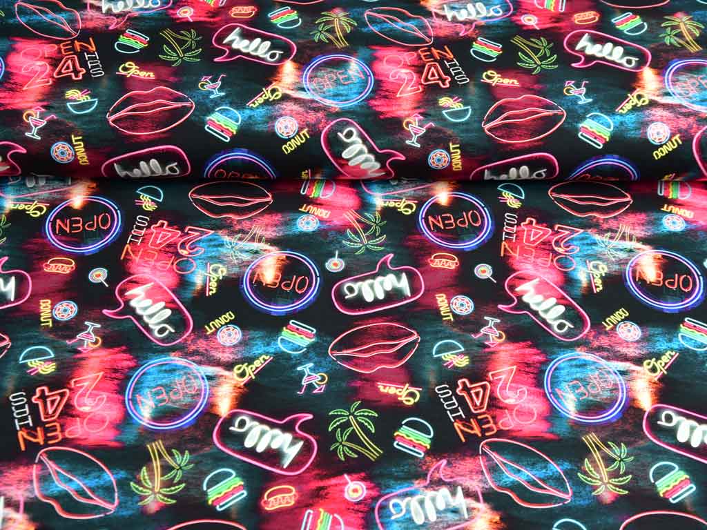 Ein schwarzer Baumwolljersey als Digitaldruck mit coolen, bunten Leuchtschriften z.B. "Hello" und "Open" sowie Palmen und ein sich im Meer widerspiegelnder Sonnenuntergang.