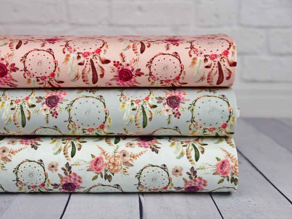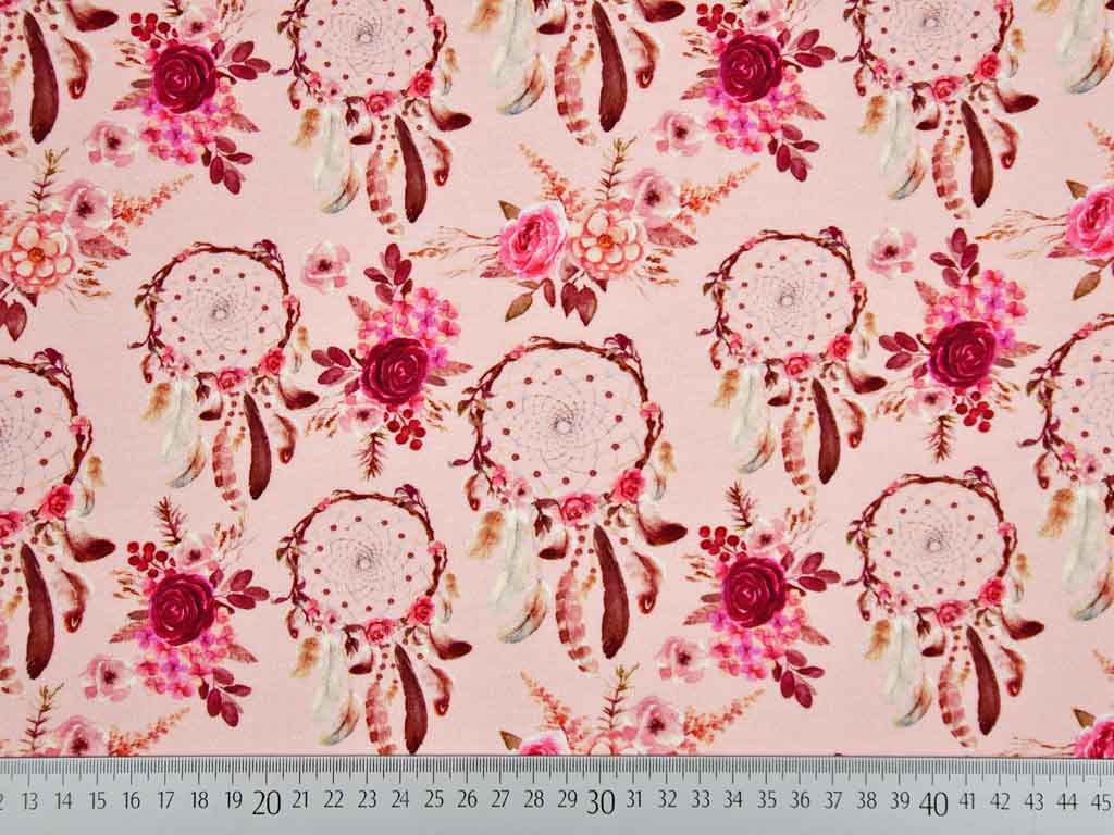 Ein hell apricotfarbener Jersey als Digitaldruck mit romantischen, weinroten Rosen und Traumfängern in bordeaux und beige. Den Traumfänger zieren kleine rosa-pinke Knospen, dunkelgrüne und grau-beige Federn sowie kleine, rotbraune Zweige.
