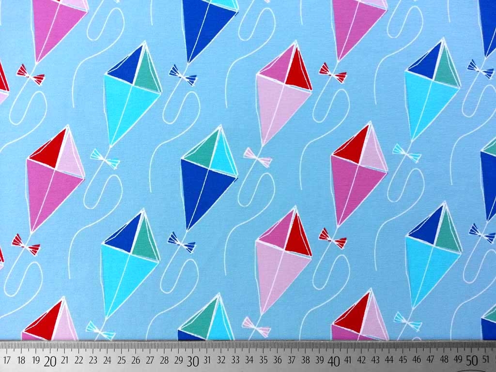 Ein weicher, eisblauer Baumwolljersey aus dem Hause Blaubeerstern mit großen Drachen in mint, türkis, royal blau, rosa und rot.