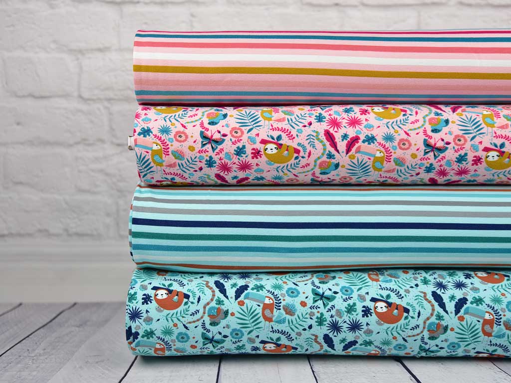 Ein weicher Baumwolljersey in rosa mit süßen Faultieren, Tukans, Schmetterlingen, Sträuchern und Blättern.
