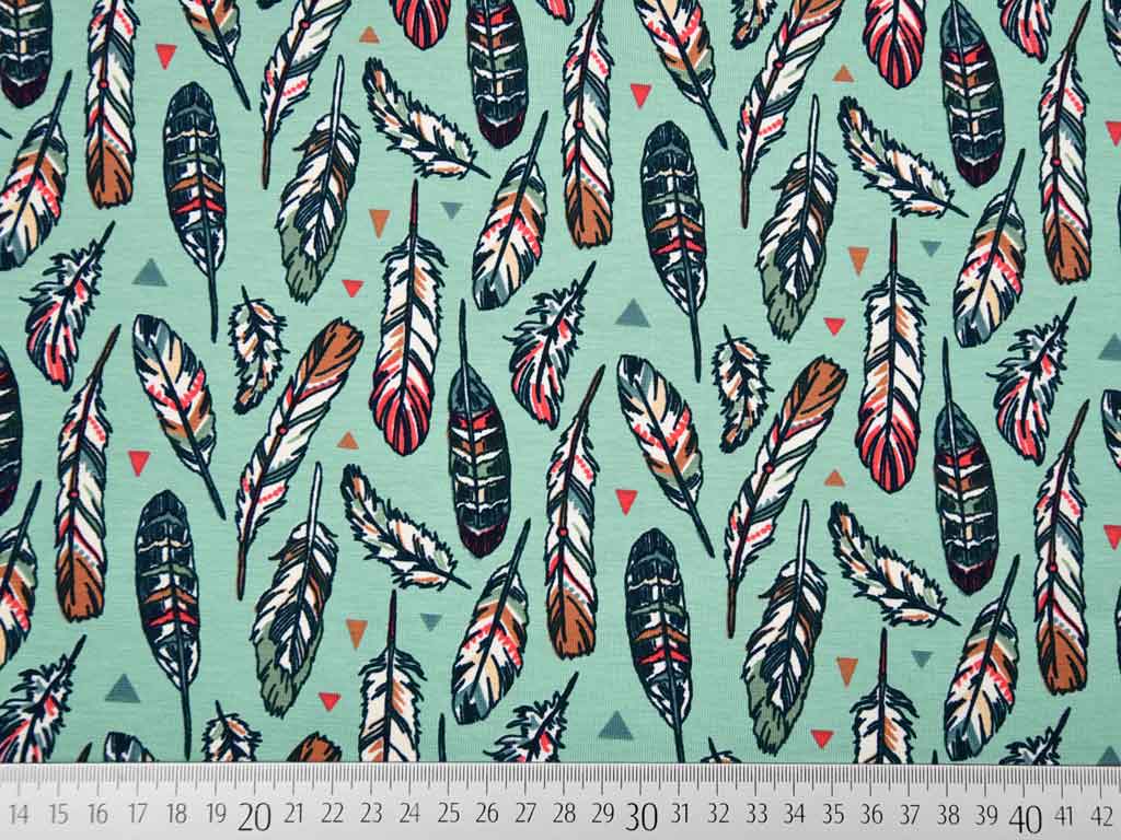 Ein weicher Baumwolljersey aus dem Hause Stenzo hier in hellgrün mit bunten Federn.