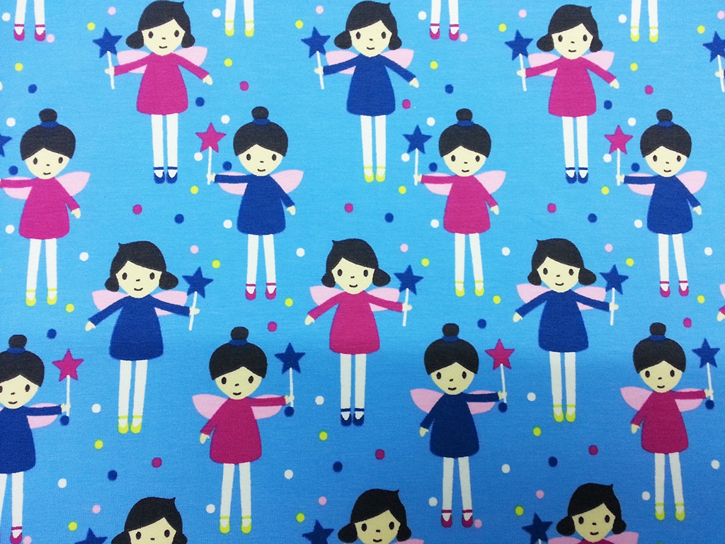 Ein mittelblauer Jersey von Blaubeerstern mit dem Namen Fiona Fee mit blauen und beerefarbenen Feen mit rosa Flügeln und Zauberstäben in der Hand. Im Hintergrund sind viele kleine, gelbe, weiße, beerefarbenen und blaue Pünktchen.