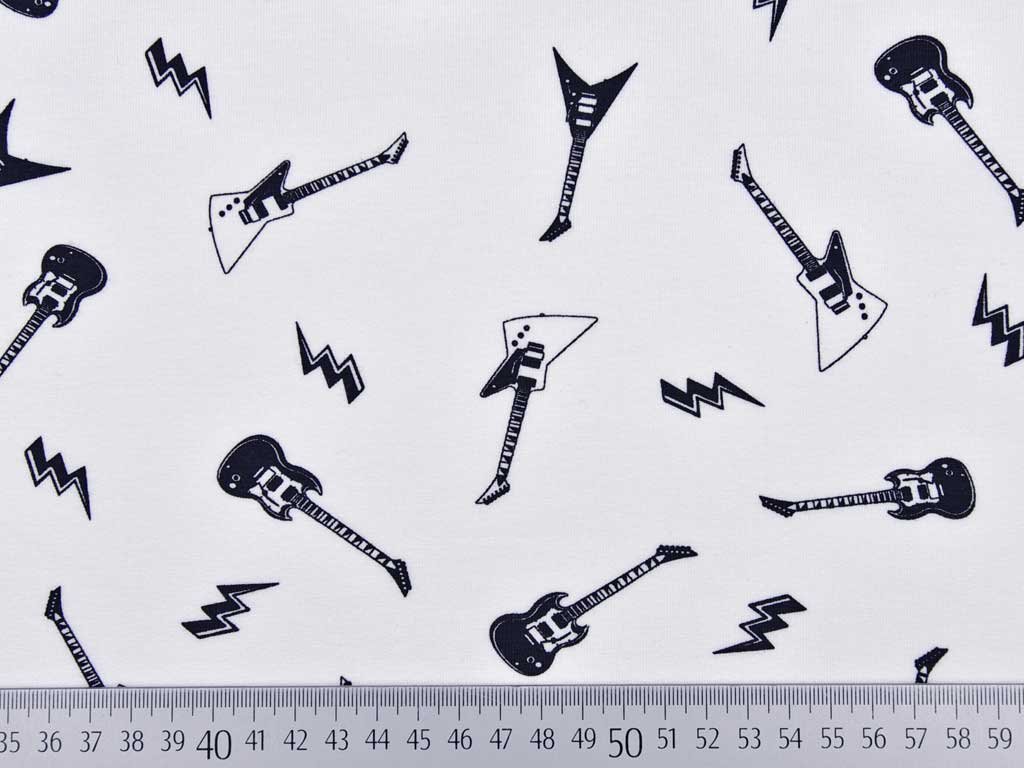 Ein weicher Baumwolljersey in weiß mit schwarzen Guitarren. Einfach super lässig!
