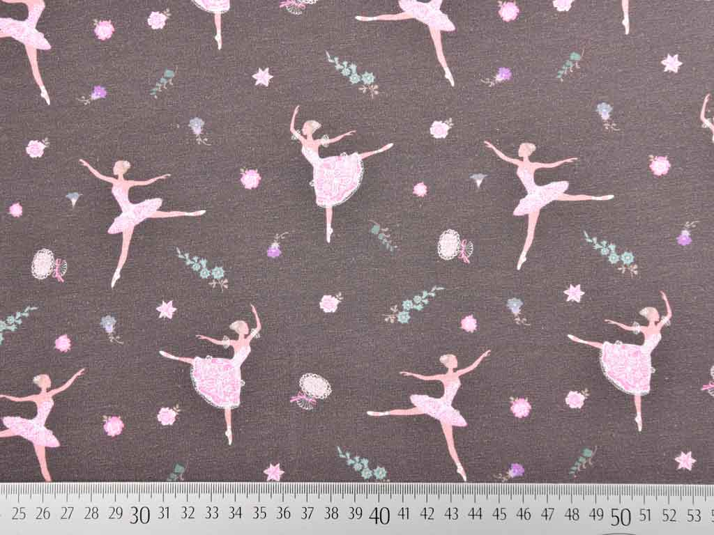 Ein weicher, matt brauner Jersey mit Ballerinas und rosa und mintfarbenen Blümchen.