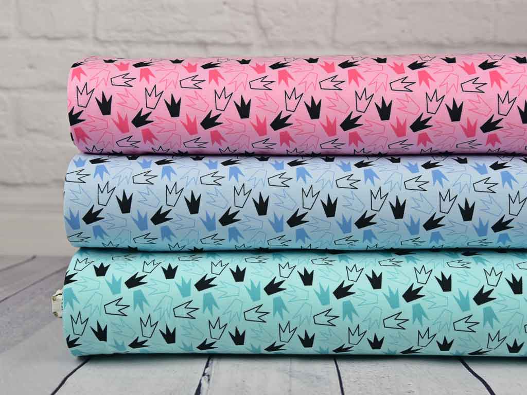 Ein toller, weicher Jersey aus Baumwolle in hellblau mit Kronen in schwarz und mittelblau. Genau richtig für kleine oder große Prinzen