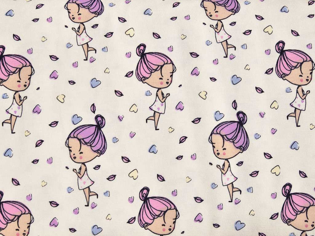 Ein weicher Baumwolljersey mit Mädchen und Blättern, die bei UV-Licht ihre Farbe zeigen. Ohne UV-Licht sind nur die schwarzen Konturen sichtbar.
