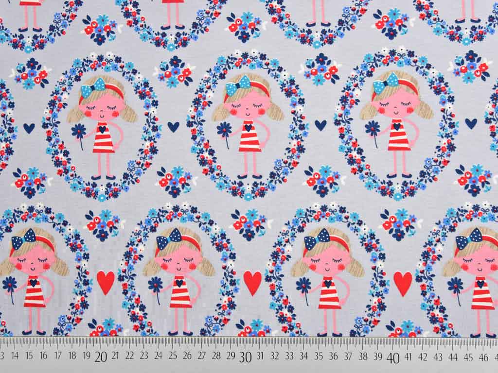 Ein niedlicher, hellgrauer Jersey mit Matrosenmädchen umgeben von Blumenkränzen. . Das Mädchen hat ein rot weiß geringeltes Kleid an und hält eine blaue Blume in der Hand. Sehr süß sind die kleinen Zöpfe und der Haarreif mit einer blauen Schleife. Der Blumenkranz setzt sich aus kleinen Blümchen in weiß, rot und verschiedenen Blautönen zusammen. Rote Herzen sind zwischen den Blumen plaziert. Einfach so süß!