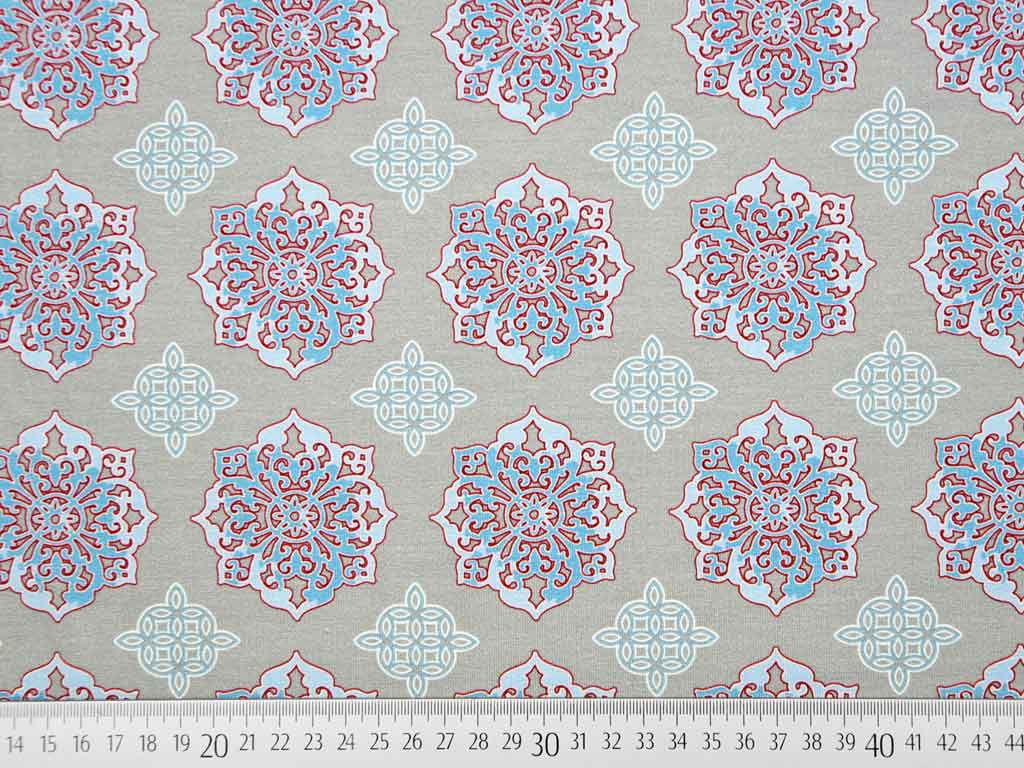 Ein weicher Baumwolljersey aus hochwertiger Kompaktbaumwolle in grau bedruckt mit opulenten Ornamenten in mint und blau.