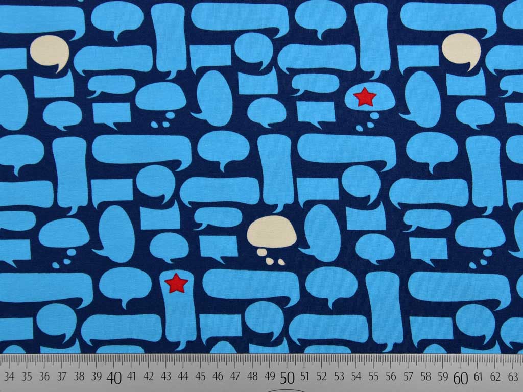 Ein weicher, dunkelblauer Baumwolljersey mit türkis-farbenen Sprechblasen. Manche Sprechblasen sind cremeweiß und mit rotem Stern.