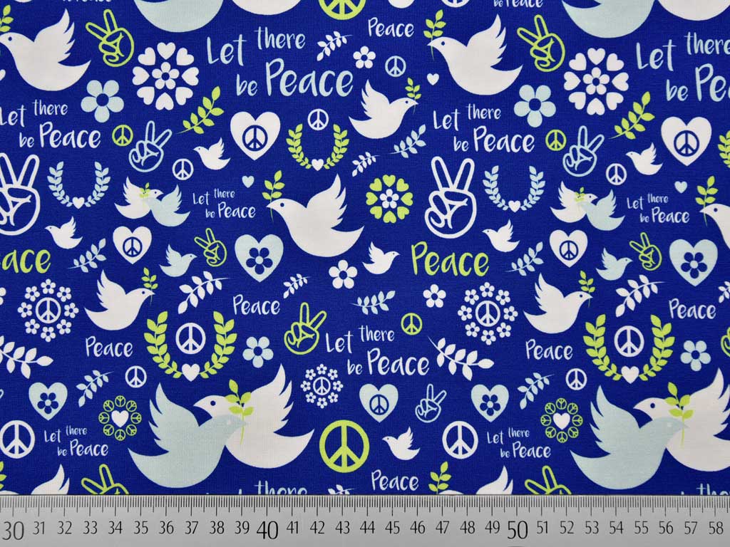 Ein blauer Baumwolljersey von Lycklig produziert von Hilco mit lindgrünen und weißen Tauben, Peace Zeichen und Blumen.