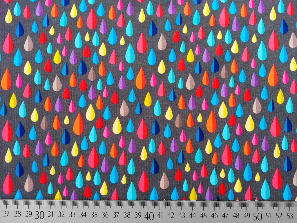 Ein dunkelgrauer Jersey (Colour Drizzle) von Hamburger Liebe aus der Serie Birds of a Feather mit bunten Tropfen in pink, türkis, orange und gelb. Produziert von Hilco in gewohnt hochwertiger Oeko-Tex Standard 100 Qualität.