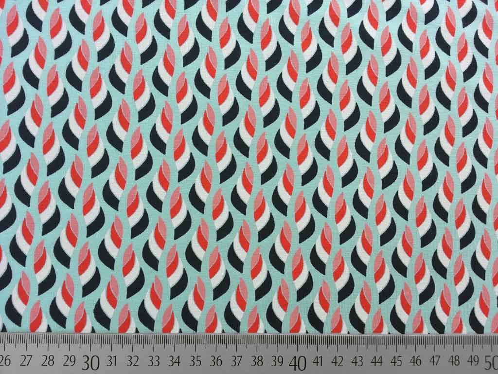 Ein weicher Jersey in eisblau mit bunten Muscheln in coralle, dunkelblau und weiß.