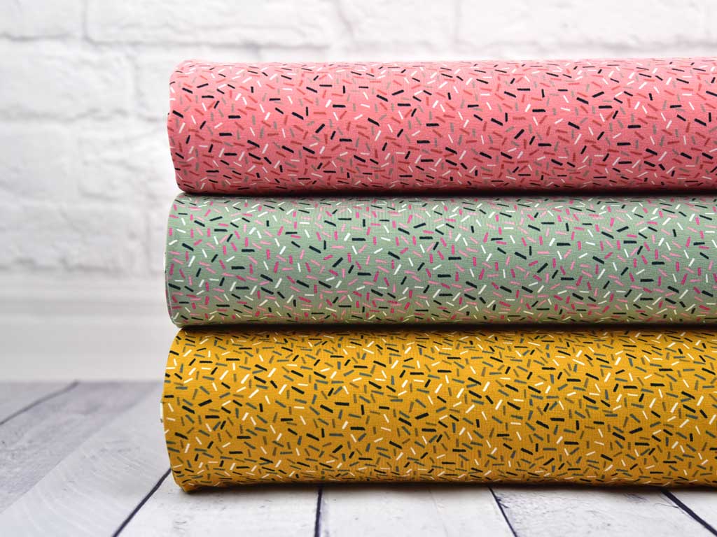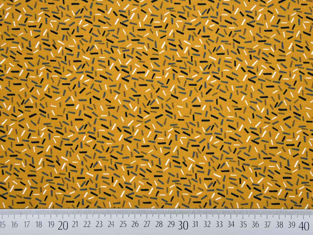 Ein weicher Baumwolljersey in ocker mit bunten Streuseln in nachtblau, mittelblau, weiß und grau.