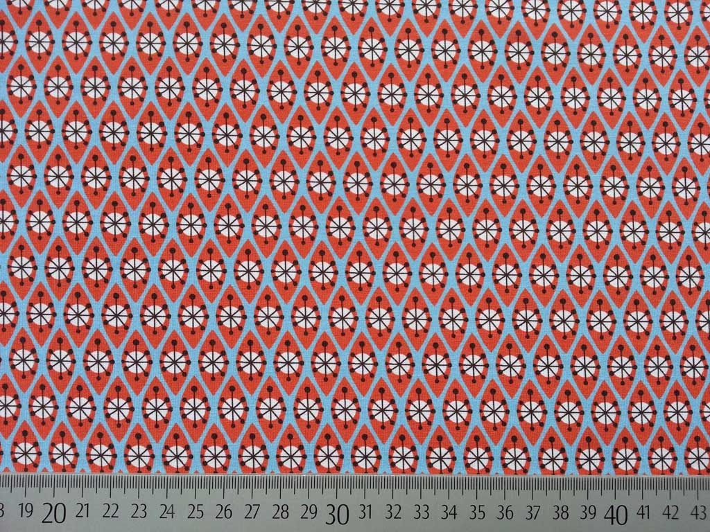 Ein hellblauer Baumwoll Jersey in Digitaldruck-Qualität von Hamburger Liebe aus der Kollektion Five O'Clock mit dem Namen Lizzy mit orange-weißen Rädchen.