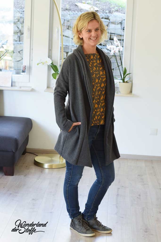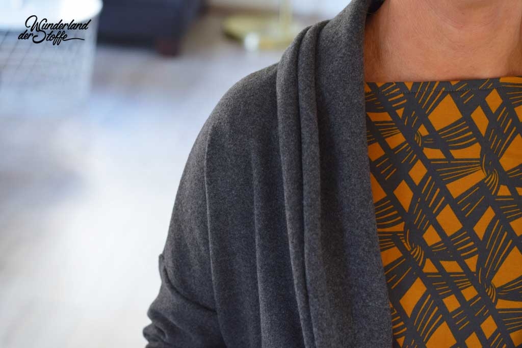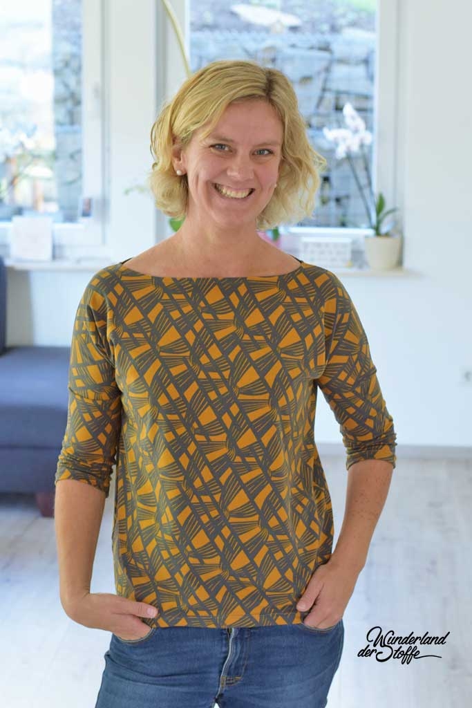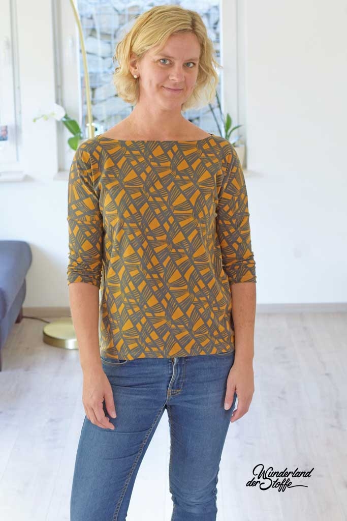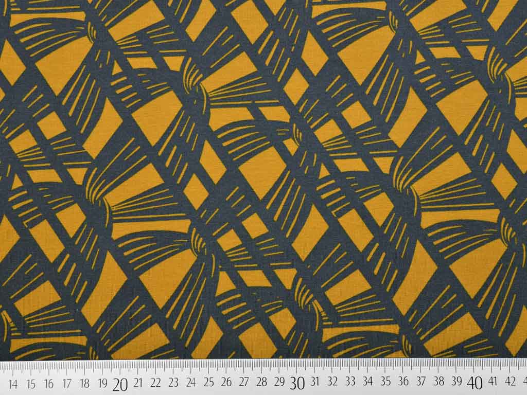 Ein weicher Baumwolljersey in senf mit einem tollen grafischen Muster in dunkelgrau.