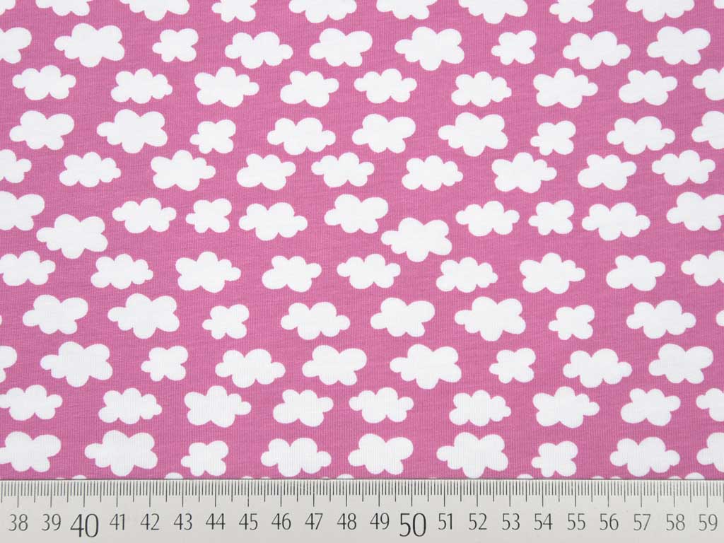 Ein weicher Baumwolljersey in Himbeer Sorbet mit kleinen weißen Wolken. Einfach total süß!!