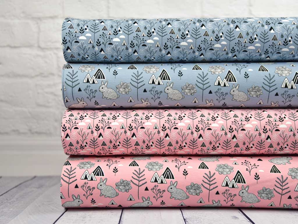Ein weicher, altrosa Baumwolljersey mit schwarzen Sträuchern, Blättern und Dreiecken im skandinavischen Design.
