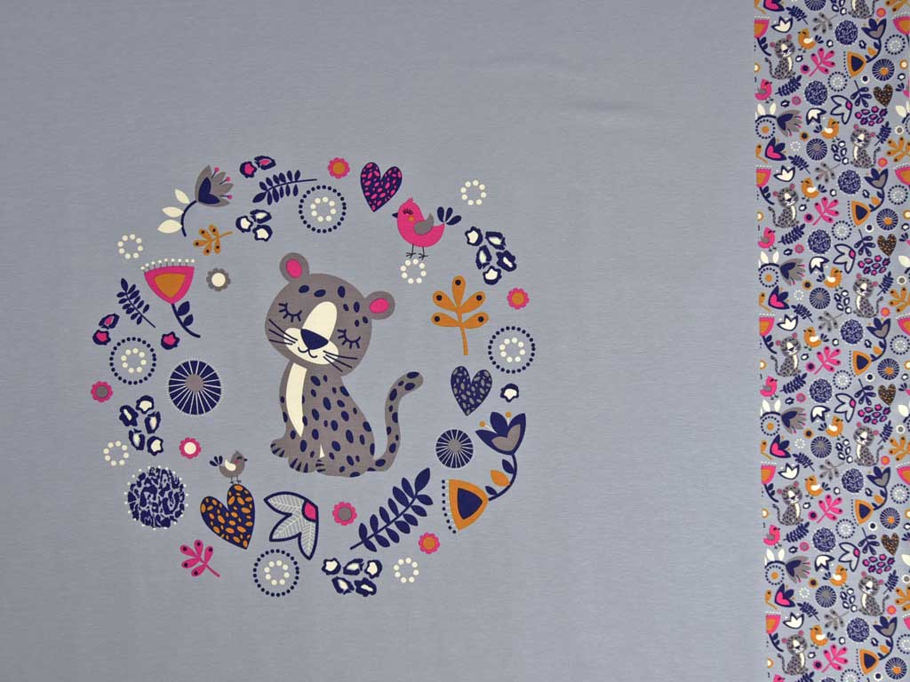 Ein weicher, grauer Baumwolljersey mit einem Leoparden mit Blumenkranz in Cremeweiß, Dunkelblau, Ocker und Dunkelgrau. Der Blumenkranz besteht aus Blumen, Blättern, Herzen und Vögeln. Dieses Hauptmotiv ist 62,3cm hoch und 60cm breit. Mit dabei ist der passende Kombistoff ebenfalls in hellgrau mit kleineren Leoparden, Blättern, Blumen, Herzen und Vögeln in Cremeweiß, Dunkelblau, Ocker und Dunkelgrau. Dieser Kombistoff ist 62,3cm hoch und 80cm breit. Der zweite passende Kombistoff ist ein Leopardenmuster in Cremeweiß und Dunkelblau mit dem Maß 140cm (breit) x 26,5cm (hoch). d.h. auf einer Breite von 140 cm bekommst Du das Leopardenmotiv plus die Kombistoffe. Ein Rapport ist ca. 88,8 cm hoch.