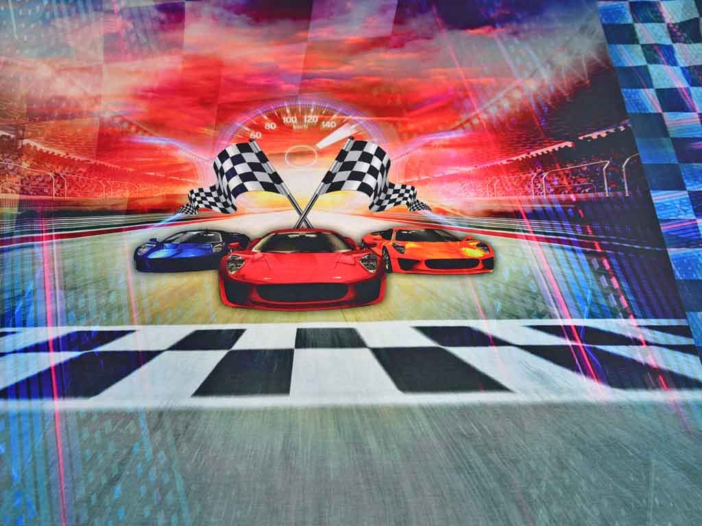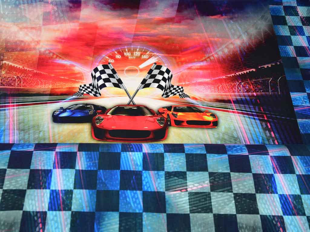 Ein weicher Baumwolljersey als Panel mit super coolem Rennauto und schwarz-weißen Flaggen sowie einem Kombistoff aus farblich passenden gemusterten Quadraten in blau-mint.