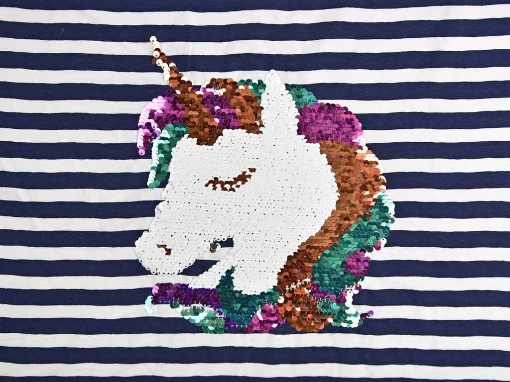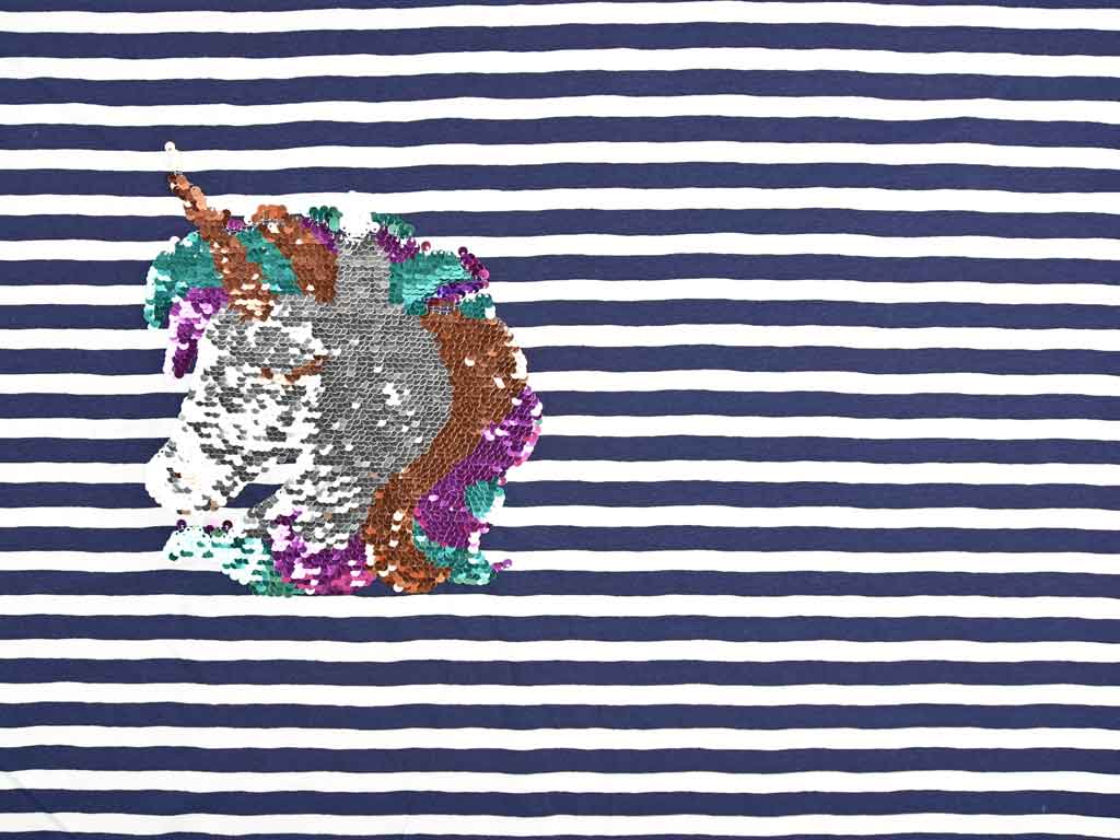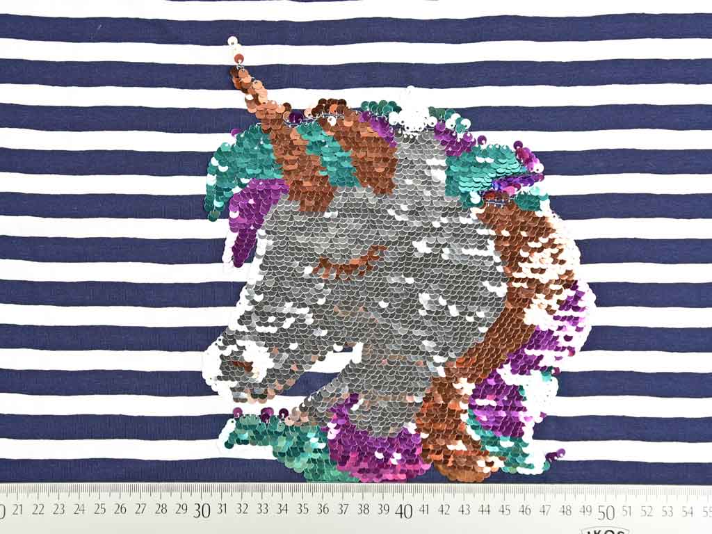 Ein dunkelblau weiß gestreifter Jersey mit einem Einhornkopf (ca.23cm hoch) aus Wendepailletten. Die Pailletten sind in der einen Strichrichtung weiß, apricot, rosa und mint; in der anderen Strichrichtung silber, apricot, rosa und mint. Ein Panel ist 66 cm hoch. Der Einhornkopf ist 20cm von der Webkante und 22cm von der untere Schnittkante platziert, der Rest der Stoffbreite ist gestreift.